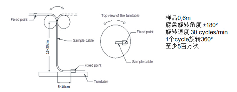 測試時,電纜自由鍛在180度範圍內左右搖擺,每分鐘40次的旋轉率,總次數要求是100萬次。因為每次彎折的點是在兩個固定件間的位置,並且反復在一個點上進行操作,所以這項測試要求比較苛刻。