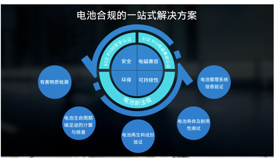 根據歐盟法規,動力電池的合規性包括安全,電磁相容,環保和永續性。 TÜV萊因動力電池認證能力獲得各國交通部授權認可,可為客戶提供電池合規的一站式解決方案,包括ECE R100安全認證,ECE R10電磁相容認證,電池新法規相關的電池有害物質檢測、電池生命週期碳足跡的計算與核查、電池再生料含量驗證、電池壽命及耐用性測試、電池管理系統資訊驗證等專業服務。
