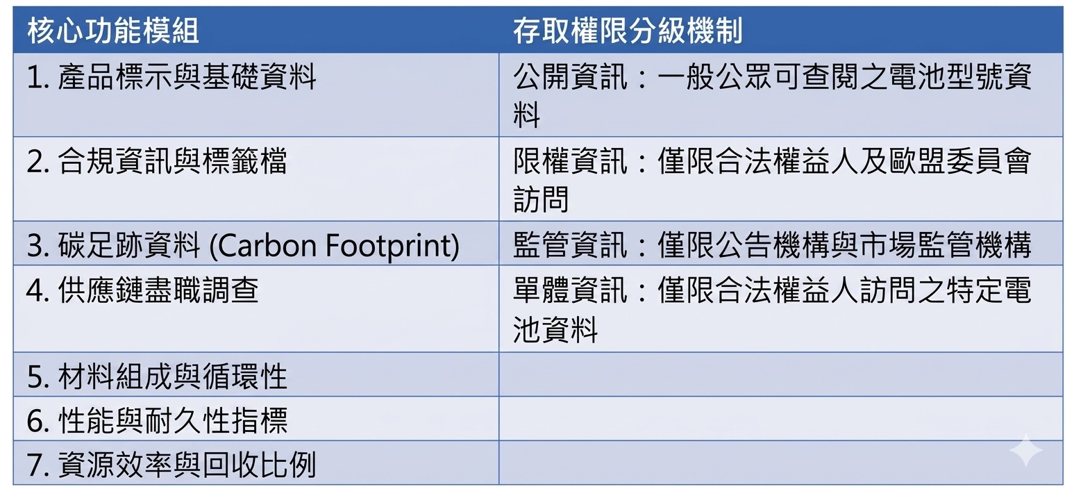 電池護照並非簡單的資訊載體,而是一個高度結構化的數位系統,包含七大核心模組,且為確保商業機密與透明度的平衡,DBP 採用嚴格的數據結構與分級存取機制。